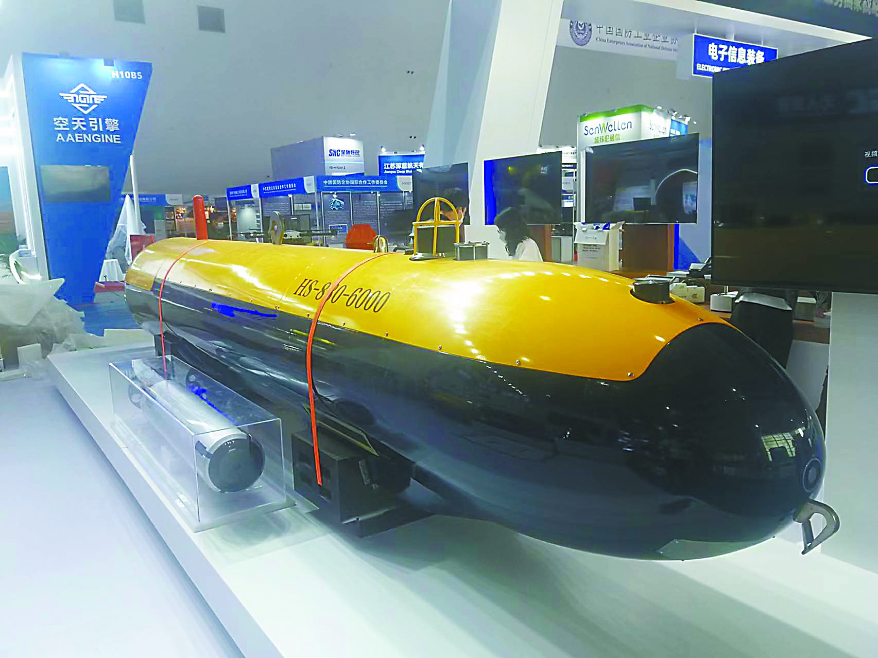 相比公眾相對熟悉的無人機和無人車,無人船和無人潛航器的知名度略低,但本屆珠海航展上展出的相關裝備具備相當高的水平。例如HS-880-6000型自主式水下航行器(AUV)就是國內首型搜救型無人潛航器。它的最大工作深度達6000米,能以3節的速度連續航行24小時,配備有深水遇險目標高分辨低照度照明系統、聲信標定向引導聲吶、水聲探測側掃聲吶等,具備工作水深范圍寬、載荷能力大、續航力長、搜尋探測能力強等特點,可對深海目標全自主精細搜尋、探測、定位,執行深海水下目標搜尋探測和海洋科學研究任務。另一款“守望者”無人潛航器個頭小巧,配備有光學探頭、戰斗部和通信設備,可以自動靠近水中或海底目標進行觀測、毀傷目標,用于執行反水雷、排障、海底管道巡檢等任務。
