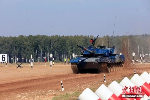 比賽采用錯時發車,藍色涂裝的中國戰車排在第4賽道出場。比賽開始后,中國參賽隊3名車組成員迅速登上坦克,隨著發動機的轟鳴,坦克在賽道上急速馳騁,迅速進入火炮射擊陣位。發現目標后,隨即調轉火炮迅速鎖定目標,果斷擊發命中目標。
