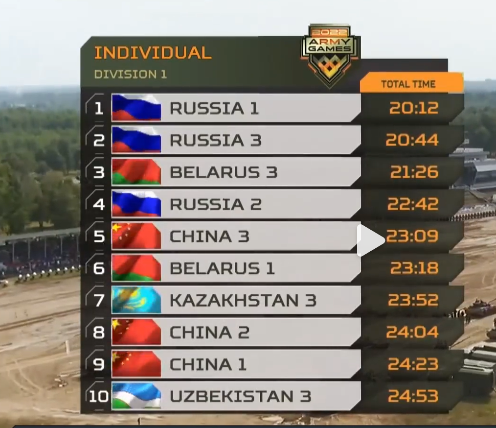 截至目前,“國際軍事比賽-2022”中 “蘇沃洛夫突擊”項目比賽全部結束,“最佳車組”第一名由中國參賽隊2號車組獲得,“最佳車組”第二名由中國參賽隊3號車組和俄羅斯參賽隊2號車組獲得,“最佳車組”第三名由中國參賽隊1號車組和白俄羅斯參賽隊3號車組獲得,伊朗參賽隊1號車組和委內瑞拉參賽隊3號車組獲評“優秀車組”。中國參賽隊車長中士劉艷、炮長下士劉金龍、駕駛員中士李金榮分別獲得“最佳車長”“最佳炮長”“最佳駕駛員”,該項目裁判長、副裁判長現場為他們頒發了獎牌和證書。